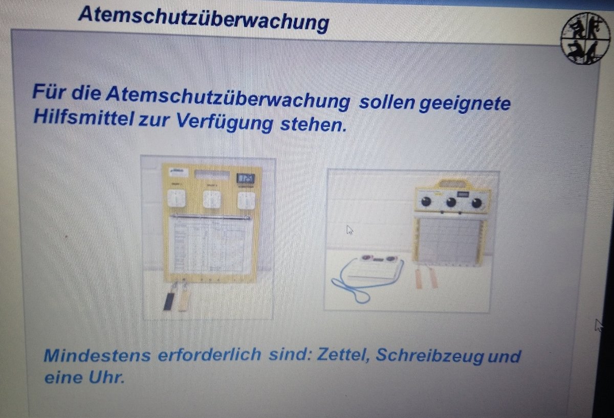 Wenn unsere Kameradinnen und Kameraden mit den Atemschutzgeräten in den Einsatz gehen, muss jemand überwachen, wie lange sie bis zum Einsatzort zur Brandbekämpfung brauchen, wieviel Restdruck ihre Geräte noch haben und wann sie aus dem Gebäude wieder zurückkehren müssen, damit sie ohne Gefahr für sich selber wieder vom Einsatz zurückkommen. Das macht die "Atemschutzüberwachung". Diejenige oder derjenige hat also eine verantwortungsvolle Aufgabe. Bastian Scholke erläuterte uns in einer Präsentation am Bildschirm die Atemschutzüberwachung und wir frischten unser Wissen online wieder auf.